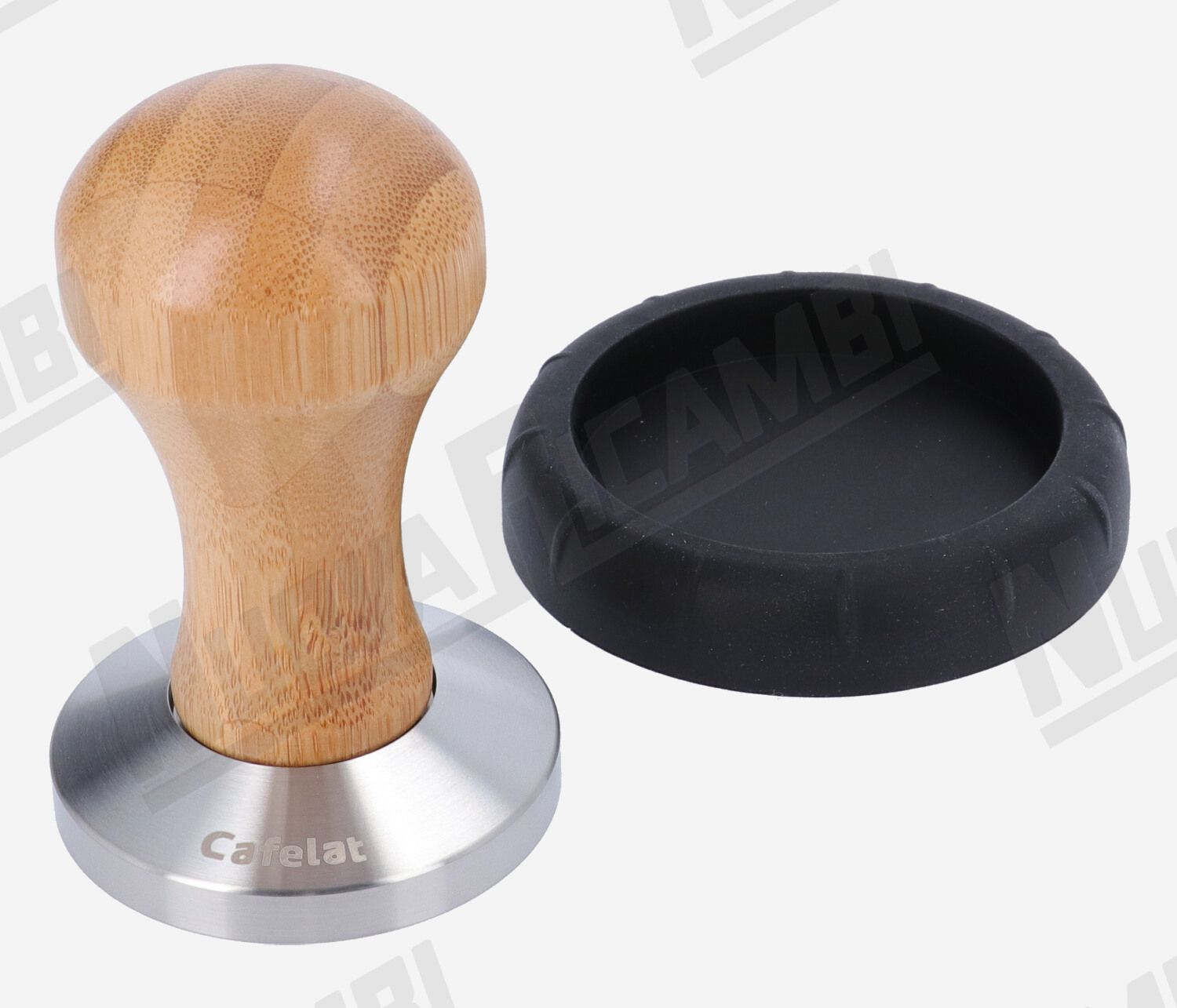 Coffee tamper made of bamboo and stainless steel.